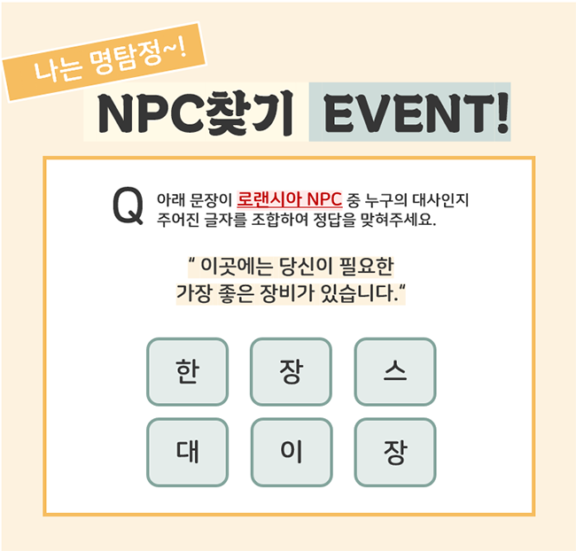 2) [NPC 찾기] 이벤트 게시판에 게시글로 정답을 작성해 주시면 참여 완료!