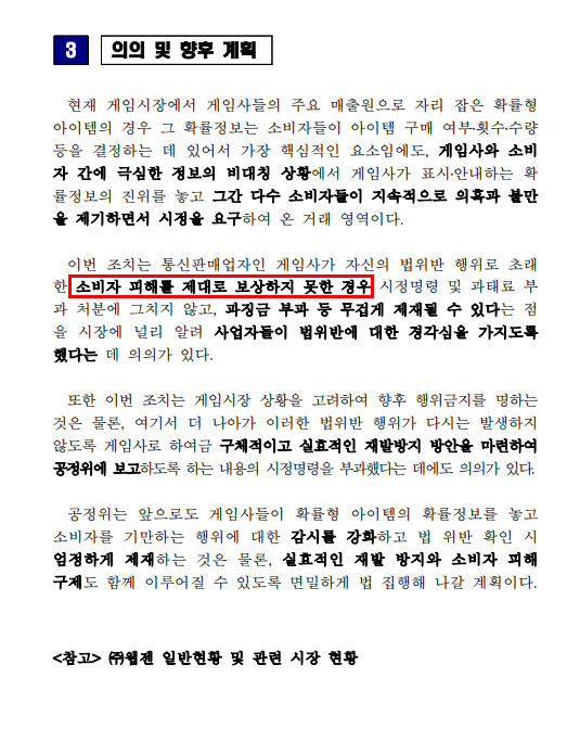 공정위에선 운영사에서 항변하였던 '확률 표기 오류'가 아닌, '거짓/기만 행위'로 판단하였고, 소비자의 피해가 거의 회복되지 않았다는 것으로 보는 것이 매우 흥미롭네요.