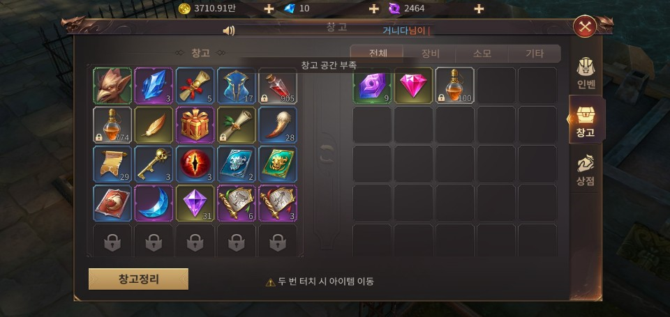 (오른쪽에 있는 물약 더블클릭하면 뜨는 <창고 공간 부족> 멘트. 좌측 창고에는 774개로 아직 여유분이 있음)
